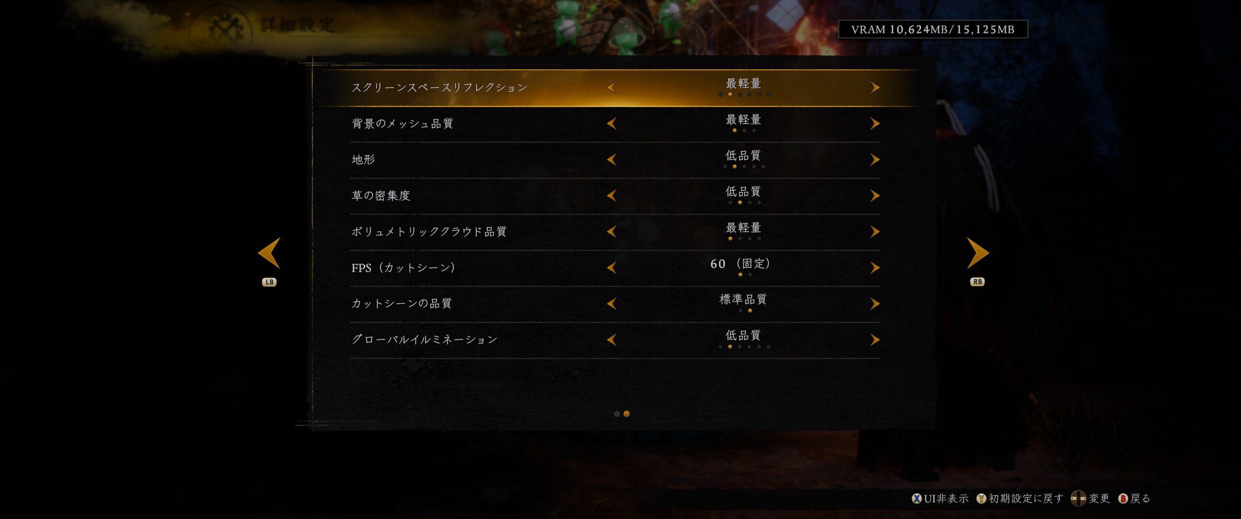 また「画面の設定」→「詳細設定」にある項目で、特に大きくパフォーマンスに影響していたのがグローバルイルミネーションだ。最軽量にすることで動作はかなり軽くなるが、その分全体的に画質がチープになってしまう。最低でも低品質にすることで、見た目がガラリと変わるので、お好みで低品質にしておくといいだろう。軽さ重視なら最軽量一択。