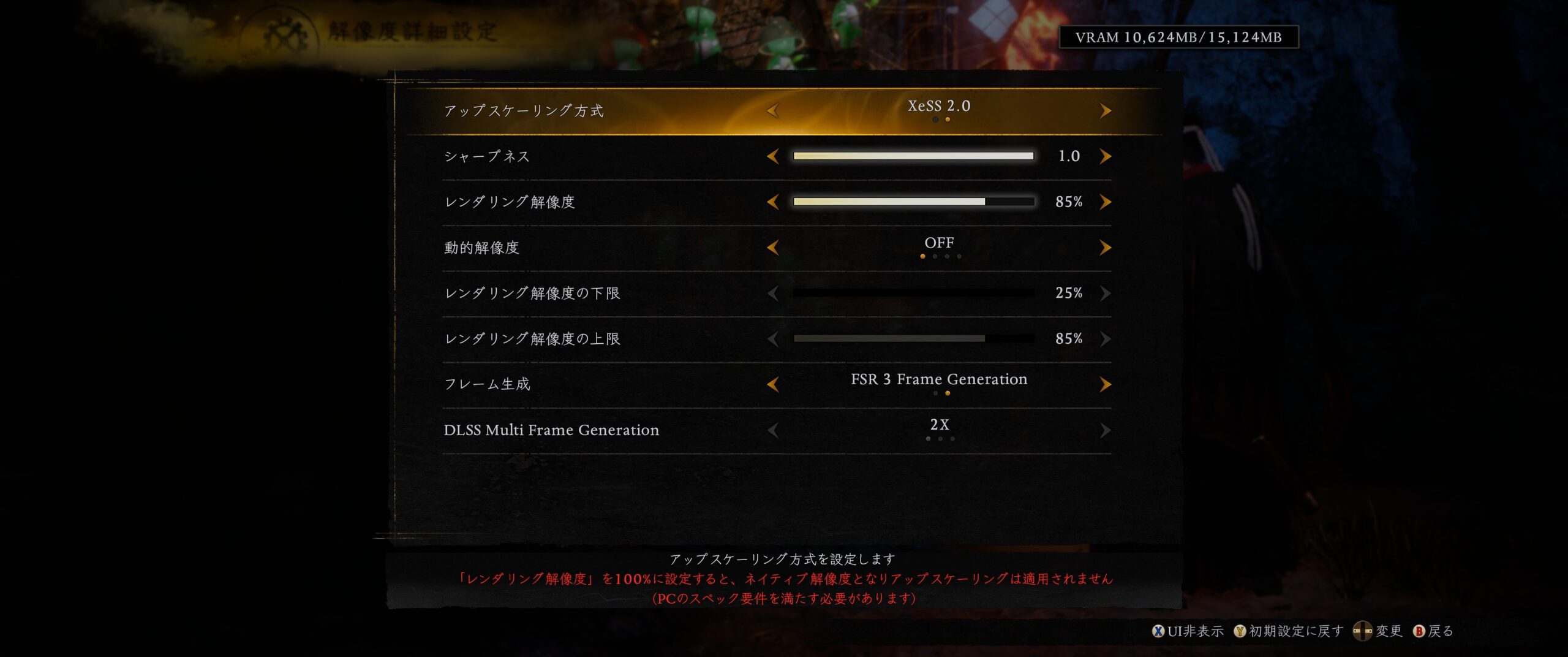 特に動作に左右する項目は、解像度詳細設定にある「レンダリング解像度」。100%だと100〜110fps前後で揺らいでしまうため、85%程度に落として固定化。「アップスケーリング方式」はXeSS V2.0を選択。FSR 3.1よりも処理がきれいに見えた。次いで、「フレーム生成」をFSR 3 Frame Generationにすることで劇的にfpsが上昇した。