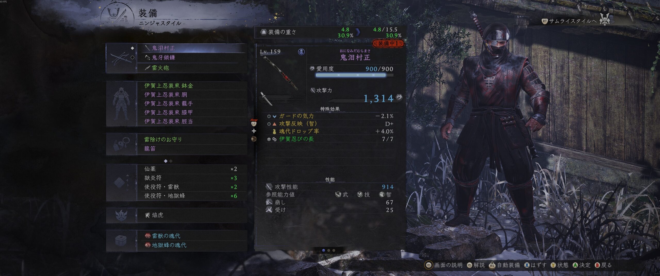 つまり頭から脚まで一式、侍用と忍者用を用意しなければならないのだ。さらに同じ武器なのに侍用と忍者用があるため、非常に分かりづらい。そして面倒くさい。せめて同じ名前の装備は共用できるようにしてほしかった。